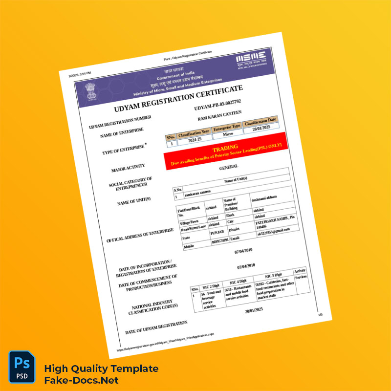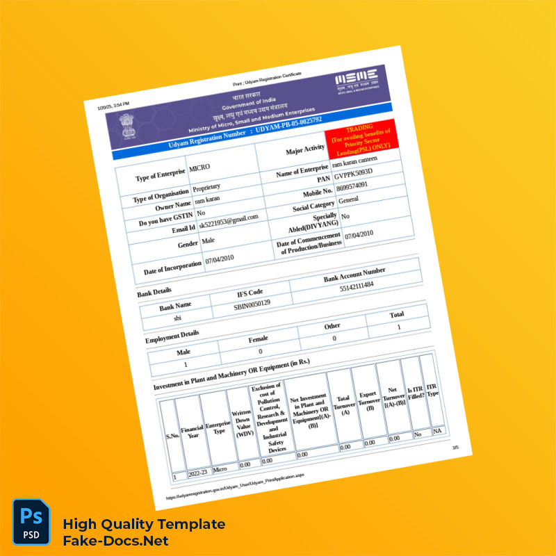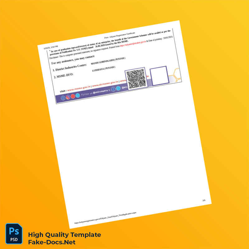 India Udyam Registration Authority Udyam Registration Certificate Template in Word and PDF formats 5 page