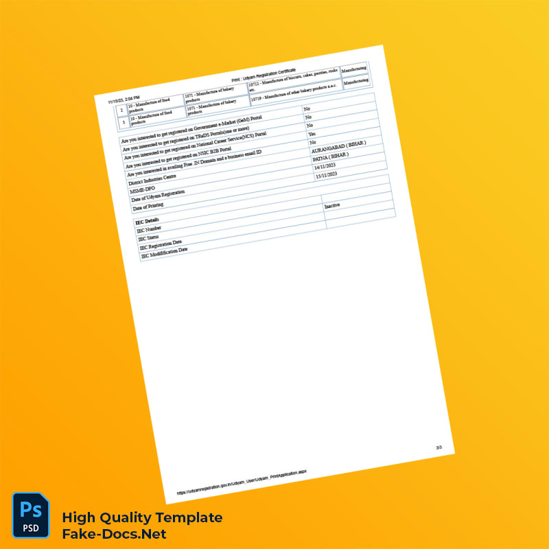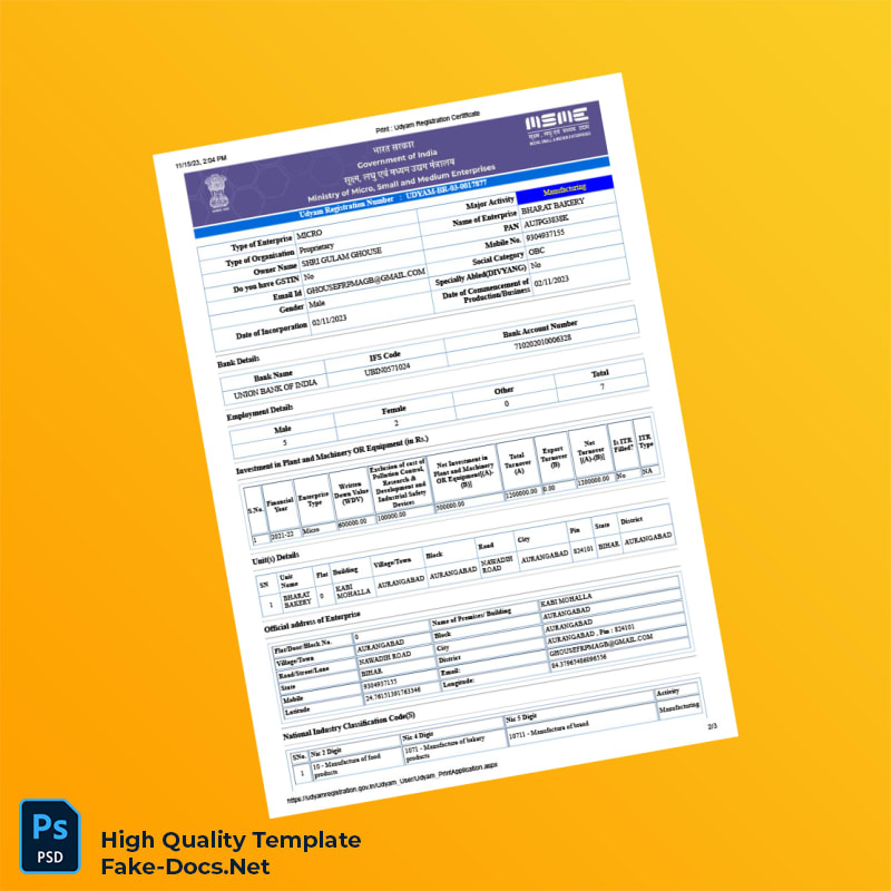 India Udyam Registration Certificate Template in Word and PDF formats 3 page