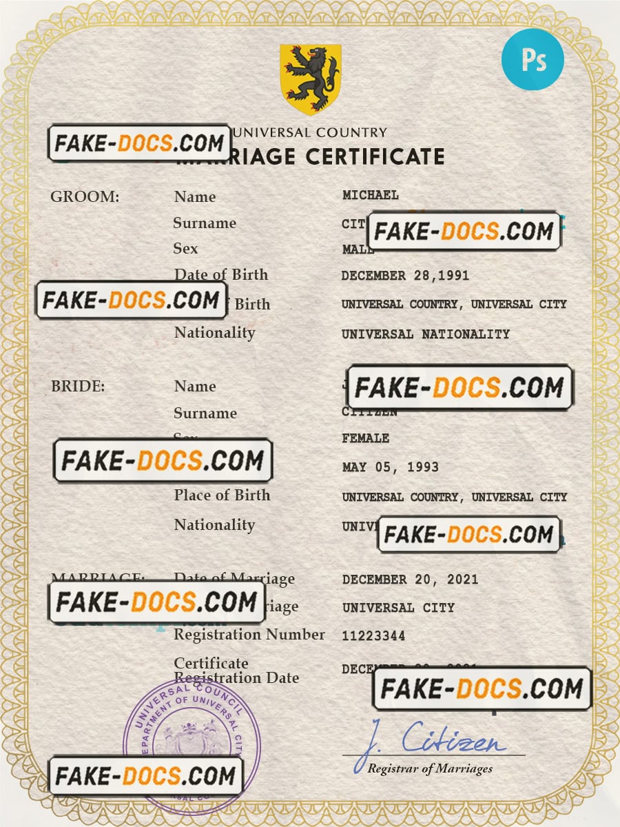 registration universal marriage certificate PSD template, fully editable