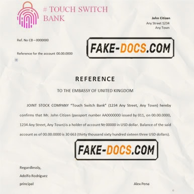touch switch bank template of bank reference letter, Word and PDF format (.doc and .pdf)