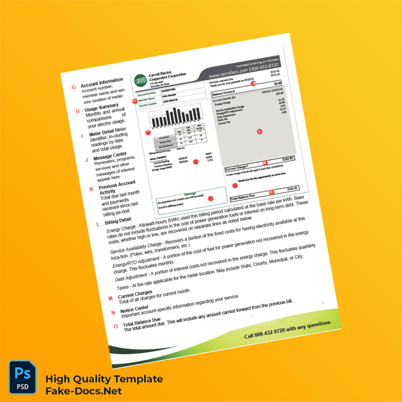 USA Carroll Electric Cooperative Corporation Editable Electricity Bill Template in Word and PDF formats 2 page