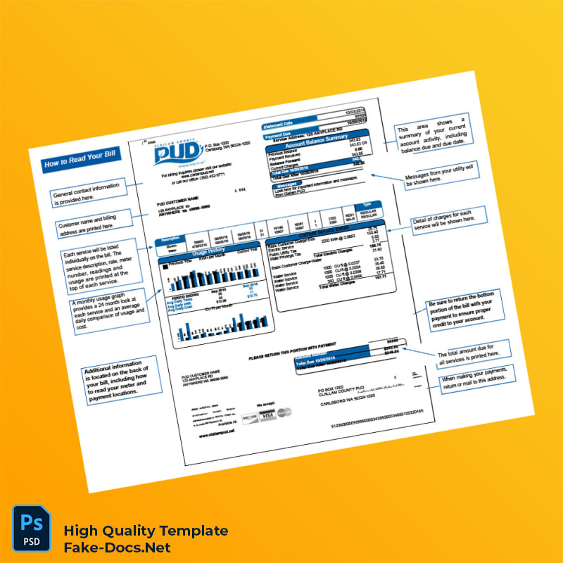 USA Clallam County PUD Editable Utility Bill Template in Word and PDF formats 2 page