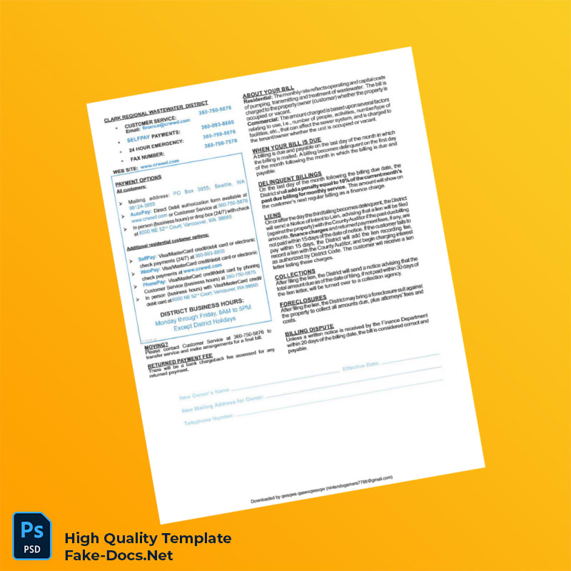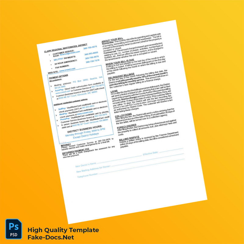 USA Clark Regional Wastewater District Editable Utility Bill Template in Word and PDF formats 2 page