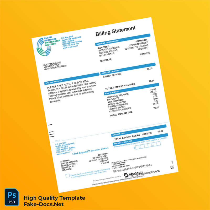 USA Clark Regional Wastewater District Editable Billing Statement Template in Word and PDF formats 2 page