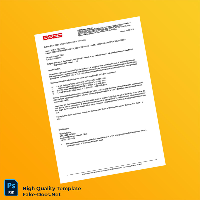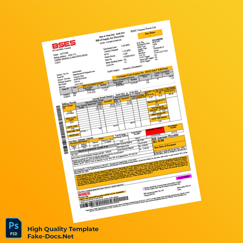 Easily customize your India BSES Yamuna Power Ltd Editable Utility Bill Template in Word and PDF formats for quick, professional invoices. Save time today!