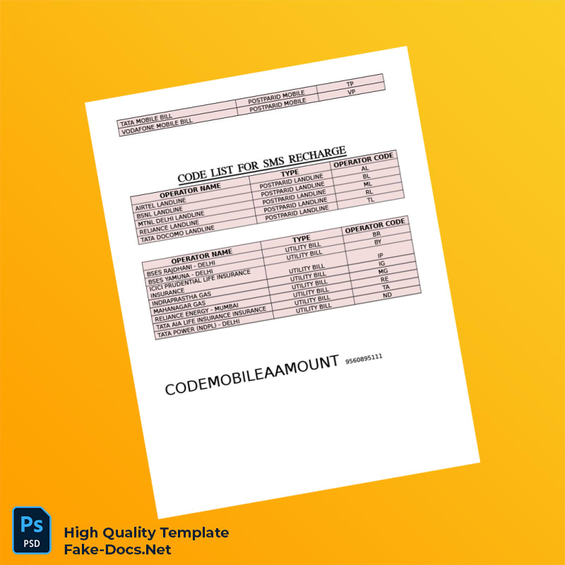 India Editable SMS Recharge Operator Codes List Template in Word and PDF formats 2 page