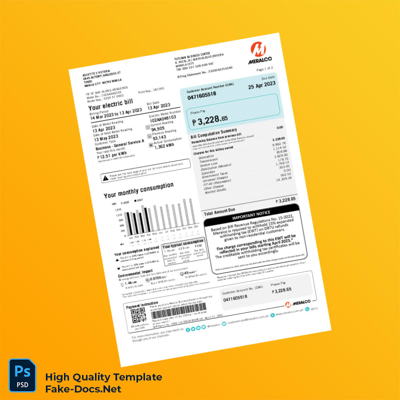 Philippines Meralco electricity utility bill template in Word and PDF format