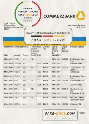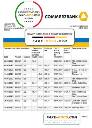 Belize Commerzbank bank statement template in Word and PDF format, good for address prove