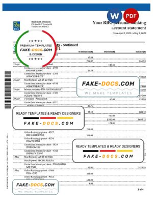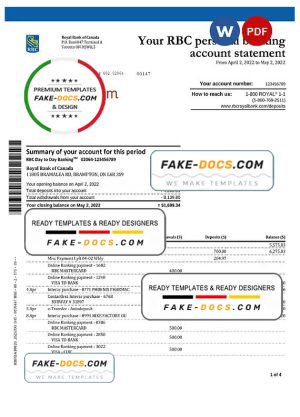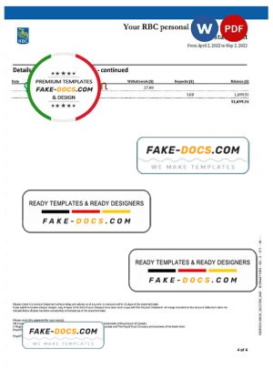 Canada Royal Bank of Canada (RBC) bank statement, Word and PDF template, 4 pages, version 2