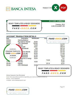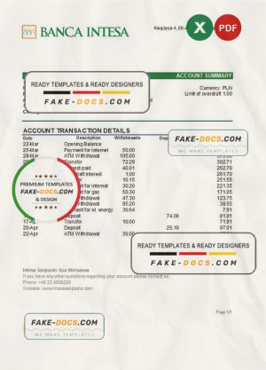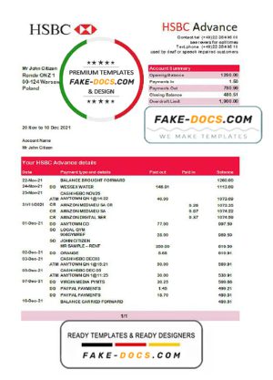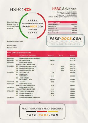 Poland HSBC bank statement easy to fill template in .xls and .pdf file format