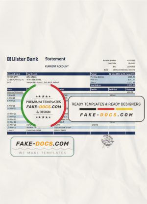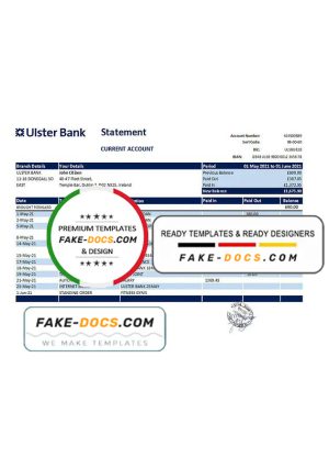 Republic of Ireland Ulster Bank statement easy to fill template in Excel and PDF format