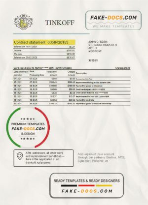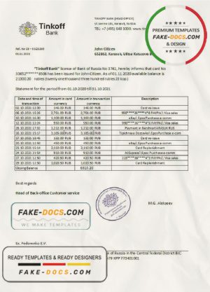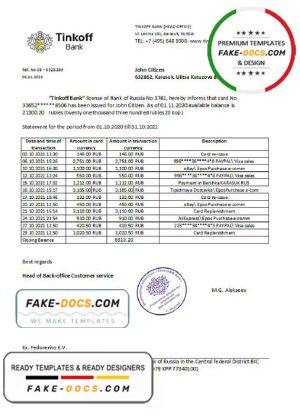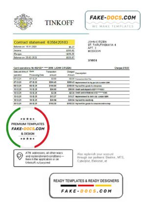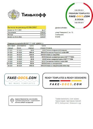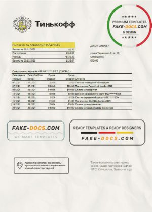 Russia Tinkoff bank proof of address statement (English version) template in Excel and PDF format