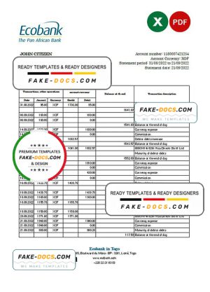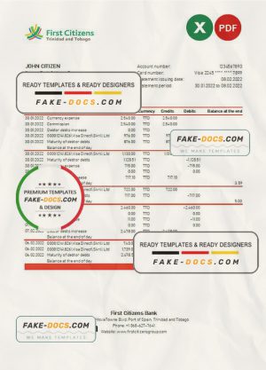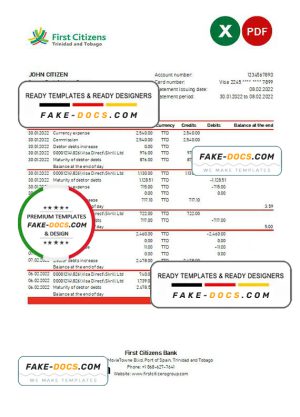 Trinidad and Tobago First Citizens bank statement, Excel and PDF template