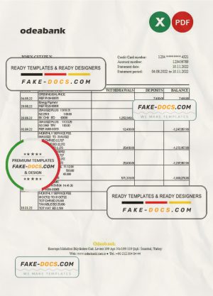 Turkey Odeabank bank statement, Excel and PDF template