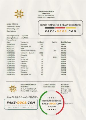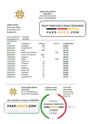 Bangladesh Sonali bank statement easy to fill template in Excel and PDF format
