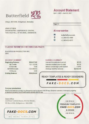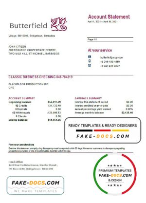 Barbados Butterfield bank statement easy to fill template in .xls and .pdf file format