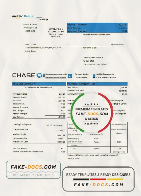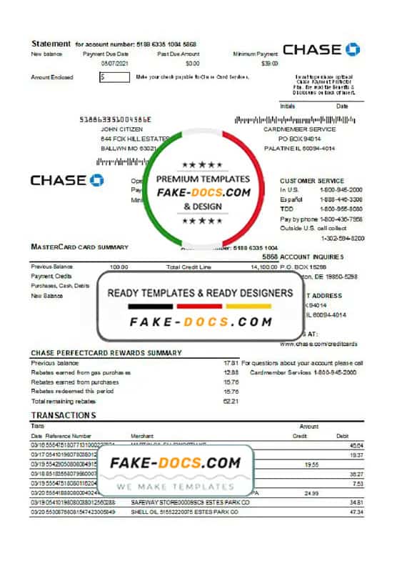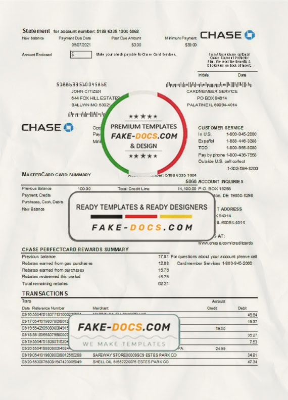 USA Chase bank Mastercard card statement easy to fill template in Excel and PDF file format