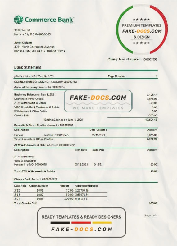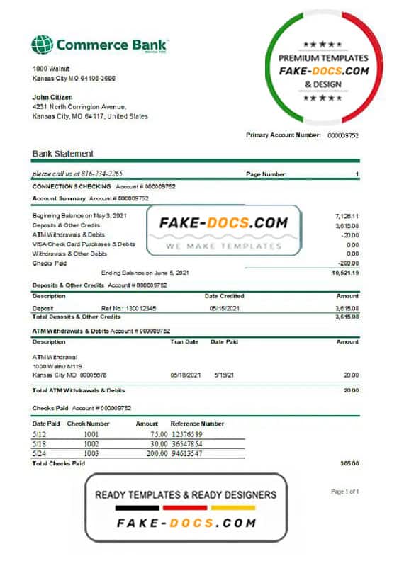 USA Commerce Bank statement easy to fill template in Excel and PDF format