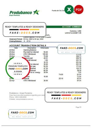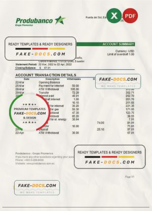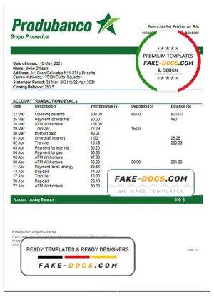 Ecuador Produbanco proof of address bank statement template in Word and PDF format