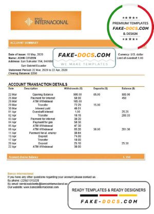 Ecuador Banco Internacional bank statement template in Word and PDF format