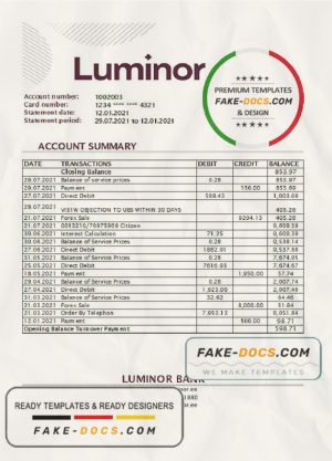 Estonia Luminor bank statement easy to fill template in .xls and .pdf file format