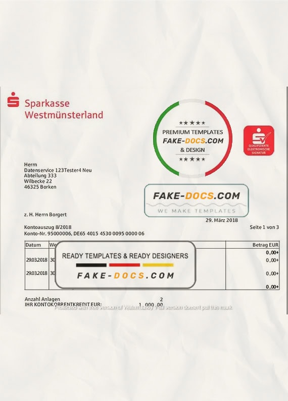 Germany Sparkasse Westmunsterland proof of address bank statement template in Word and PDF format