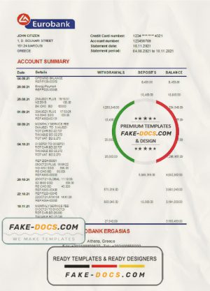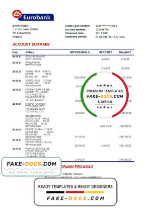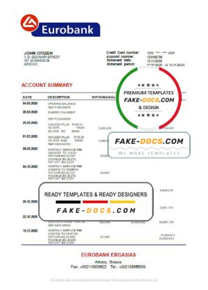 Greece Eurobank Ergasias proof of address bank statement template in Word and PDF format, .doc and .pdf format