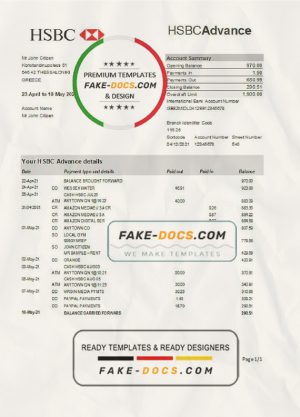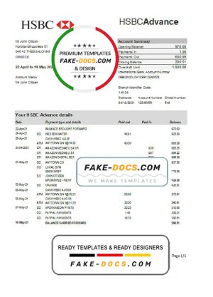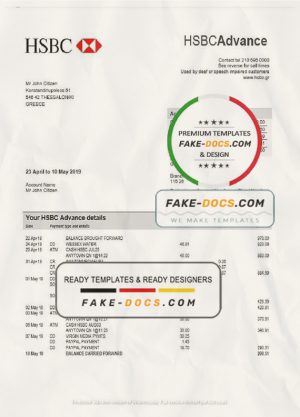 Greece HSBC bank proof of address statement template in Word and PDF format, .doc and .pdf format
