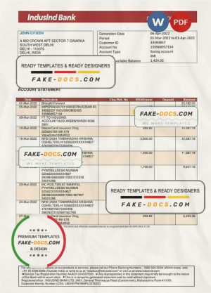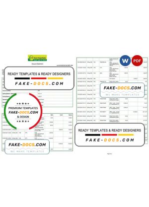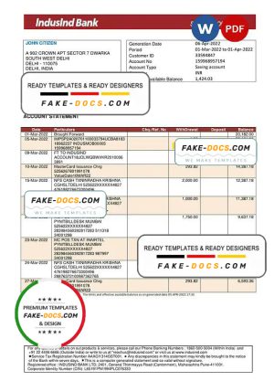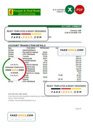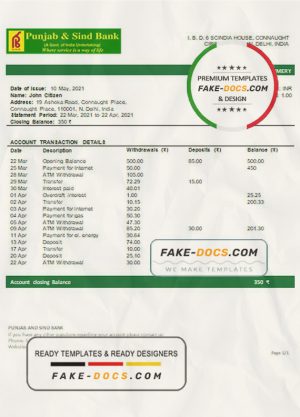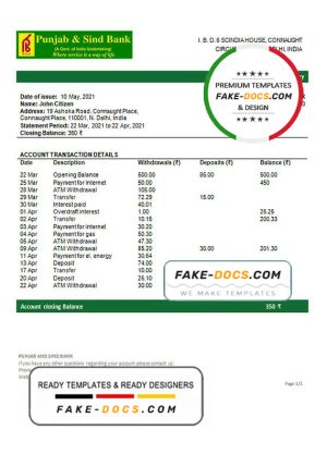 India Punjab National Bank statement Word and PDF template, 2 pages