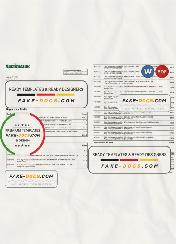 USA Austin Bank statement template in Word and PDF format, 2 pages