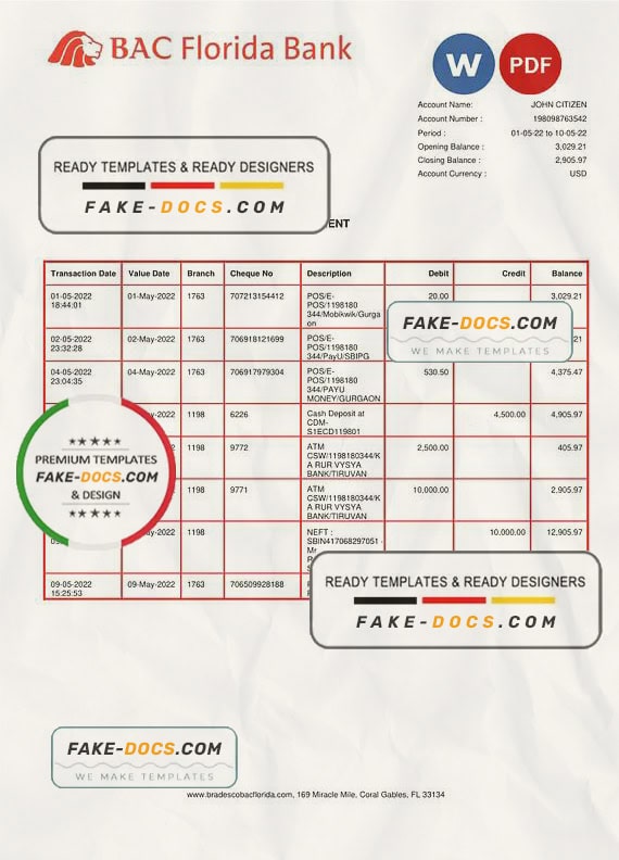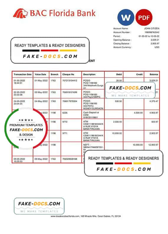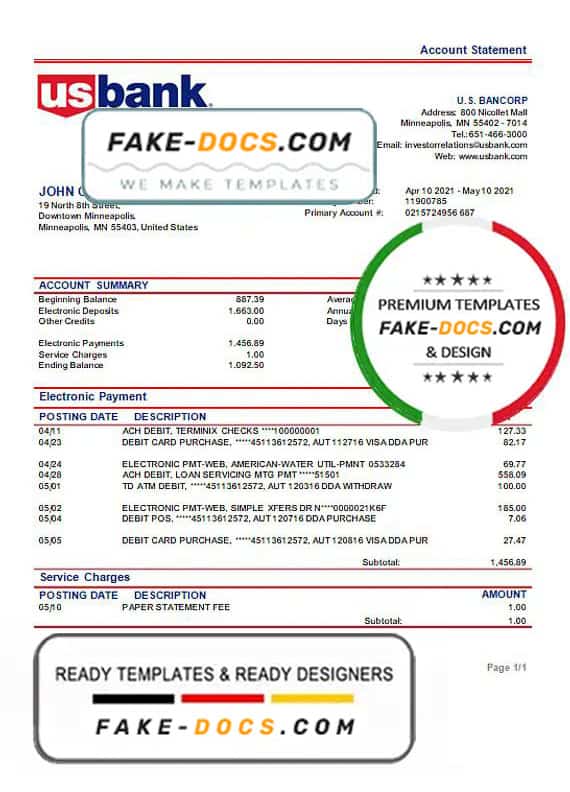 USA Bancorp bank proof of address statement template in Word and PDF format