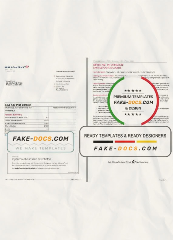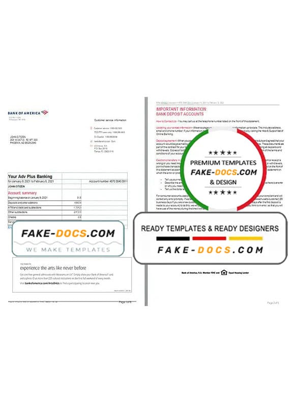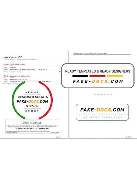 USA Bank of America bank statement template in Word and PDF format (4 pages), version 3