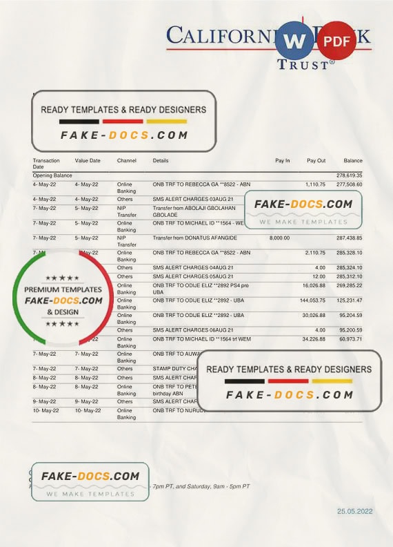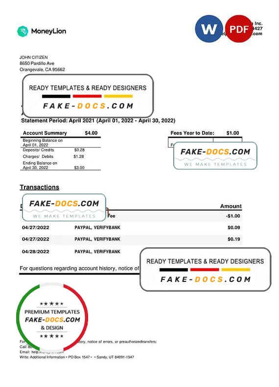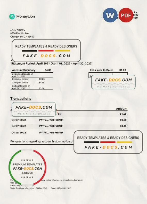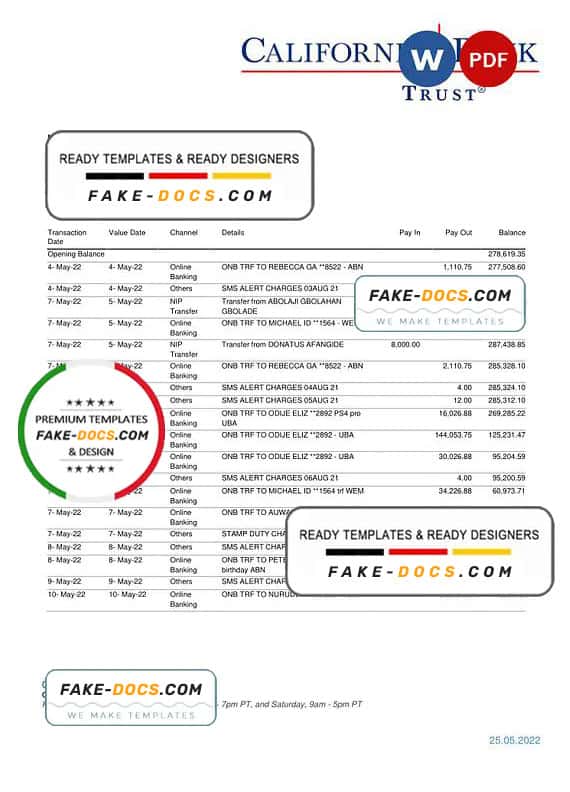 USA California BlueVine bank statement template in Word and PDF format, .doc and .pdf format