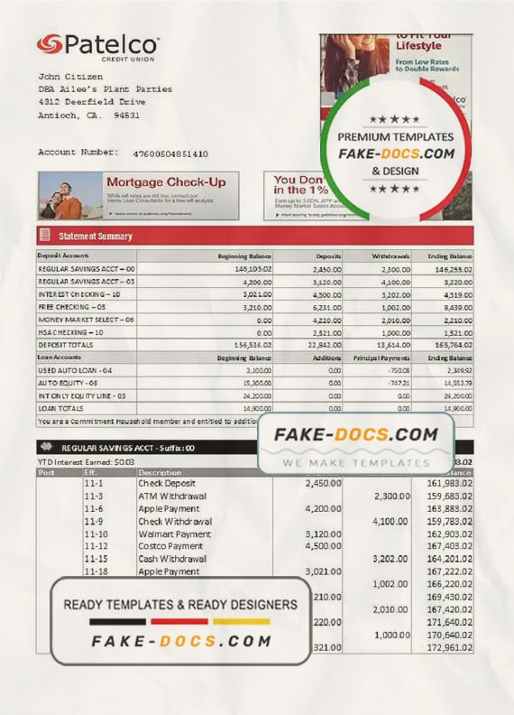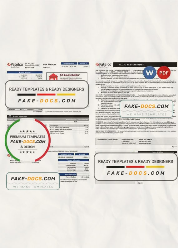 USA California Patelco bank card statement, Word and PDF template, 2 pages