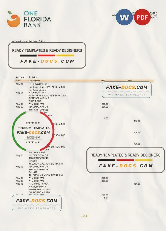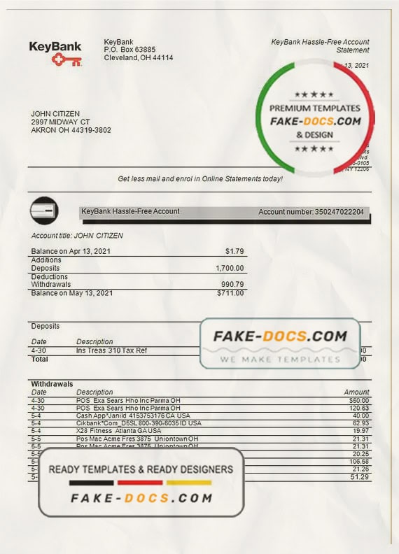 USA Ohio KeyBank bank statement template in Word and PDF format