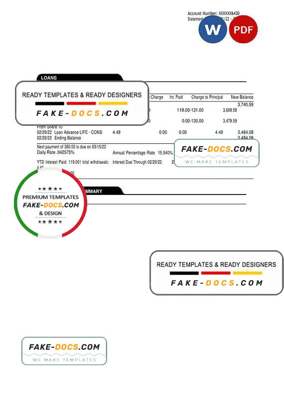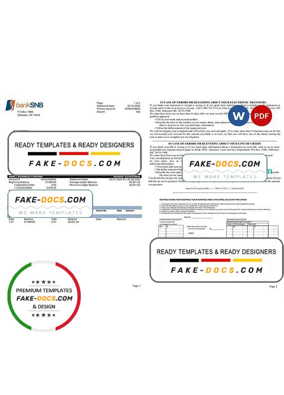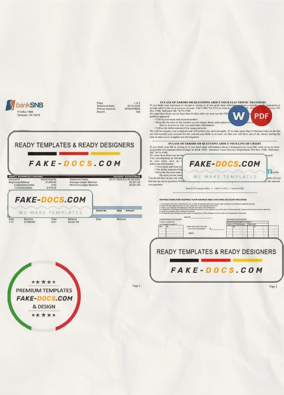 USA Oklahoma SNB bank statement Word and PDF template, 2 pages