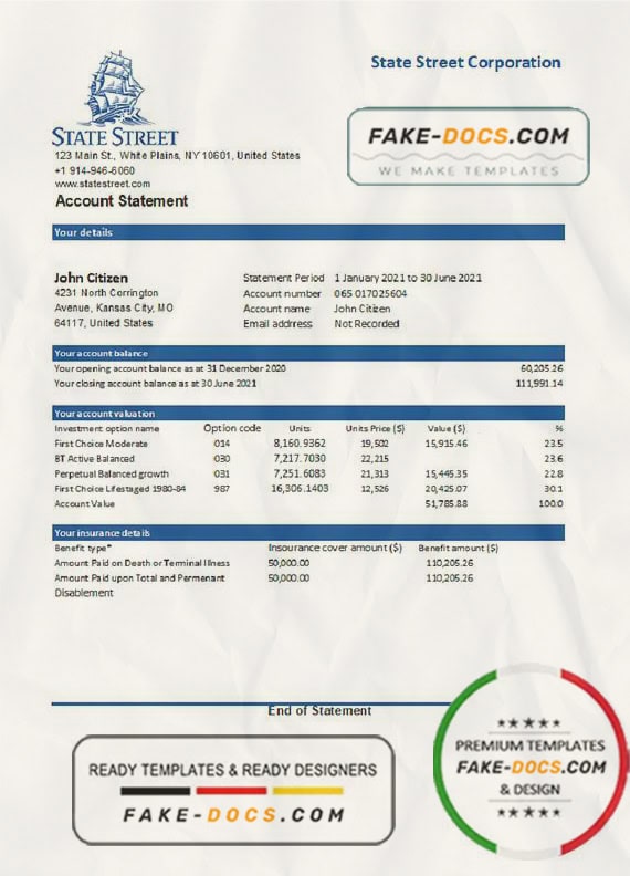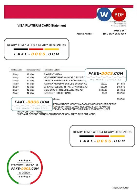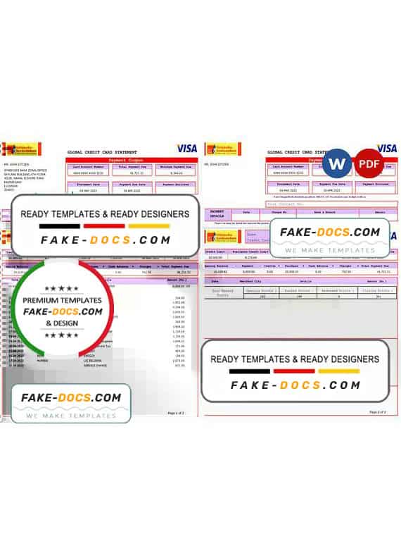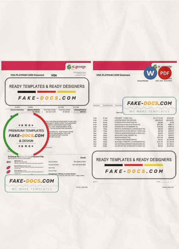 USA St. George bank visa card statement, Word and PDF template, 3 pages