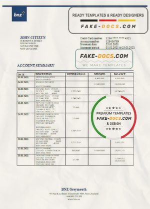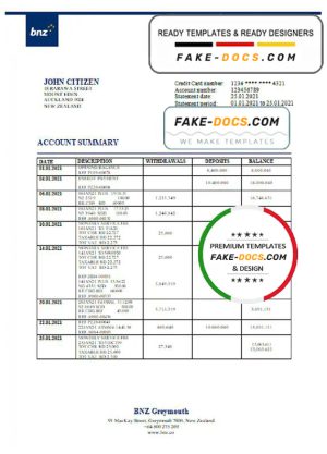 New Zealand BNZ Greymouth bank statement template in Word and PDF format