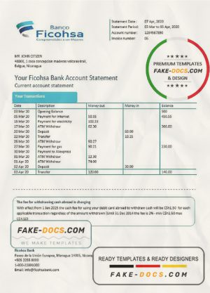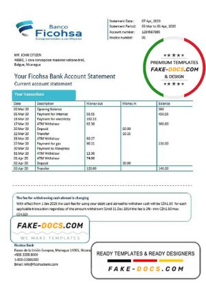 Nicaragua Banco Ficohsa bank proof of address statement template in Word and PDF format, .doc and .pdf format
