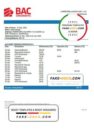 Nicaragua BAC Credomatic bank statement template, Word and PDF format (.doc and .pdf)
