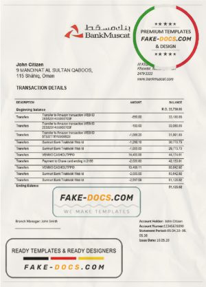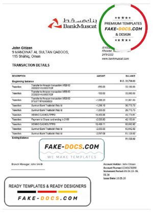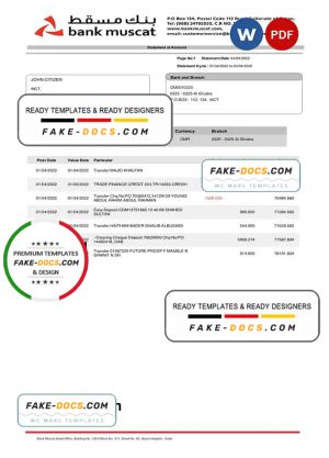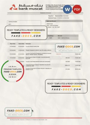 Oman Bank Muscat proof of address bank statement template in Word and PDF format (.doc and .pdf)