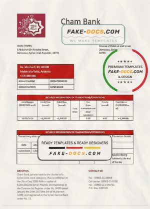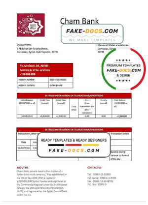 Syria Cham Bank proof of address statement template in Word and PDF format, .doc and .pdf format
