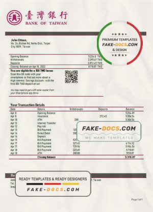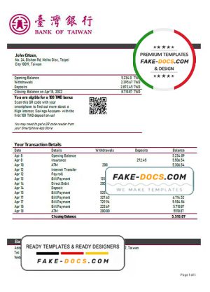 Taiwan Bank of Taiwan bank statement template in Word and PDF format, good for address prove