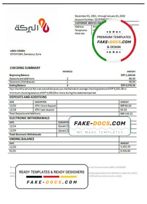 Syria Al Baraka Bank proof of address statement template in Word and PDF format, .doc and .pdf format