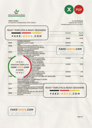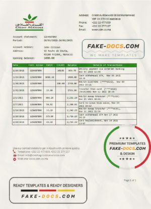 Morocco Credit Agricole bank statement template in Word and PDF format, good for address prove