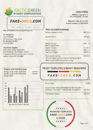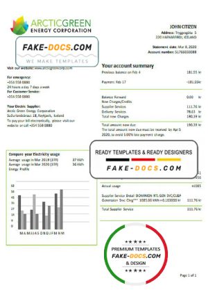 Iceland Arctic Green Energy Corporation electricity utility bill template in Word and PDF
