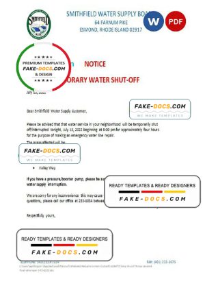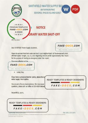 USA Rhode Island Smithfield water supply board water shut off notice, Word and PDF template