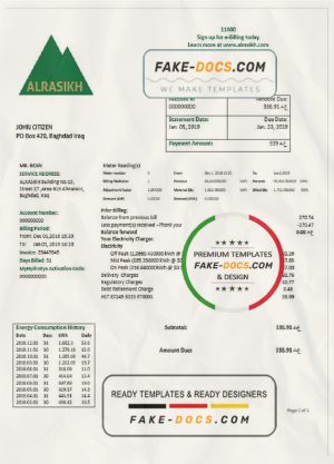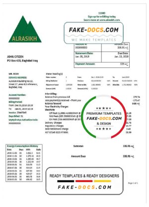 Iraq AlRasikh electricity utility bill template in Word and PDF format