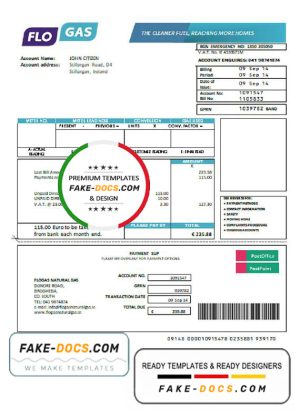 Ireland Flogas natural gas utility bill template in Word and PDF format