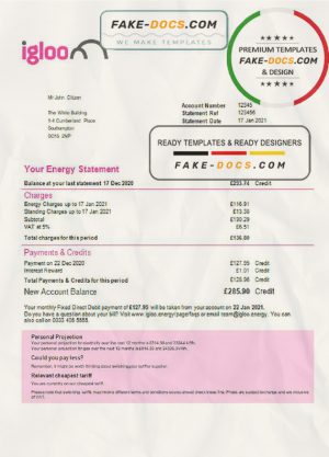 United Kingdom Igloo Energy utility bill template in Word and PDF format
